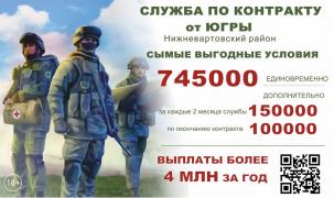 При заключении контракта через военкомат Нижневартовского района Вы получите единовременную выплату в сумме: 745 000 рублей, а общая сумма в год выплат от 4 млн. руб. К нам едут заключать контракт для участия в СВО из различных уголков страны. Подписать контракт может любой желающий. Жителям других регионов страны, заключившим контракт в Нижневартовском районе, проезд и гостиницу — оплачиваем. При подписание контракта предоставляется тактический рюкзак 32 предмета. Подробности на сайте или по телефонам круглосуточной горячей линии.